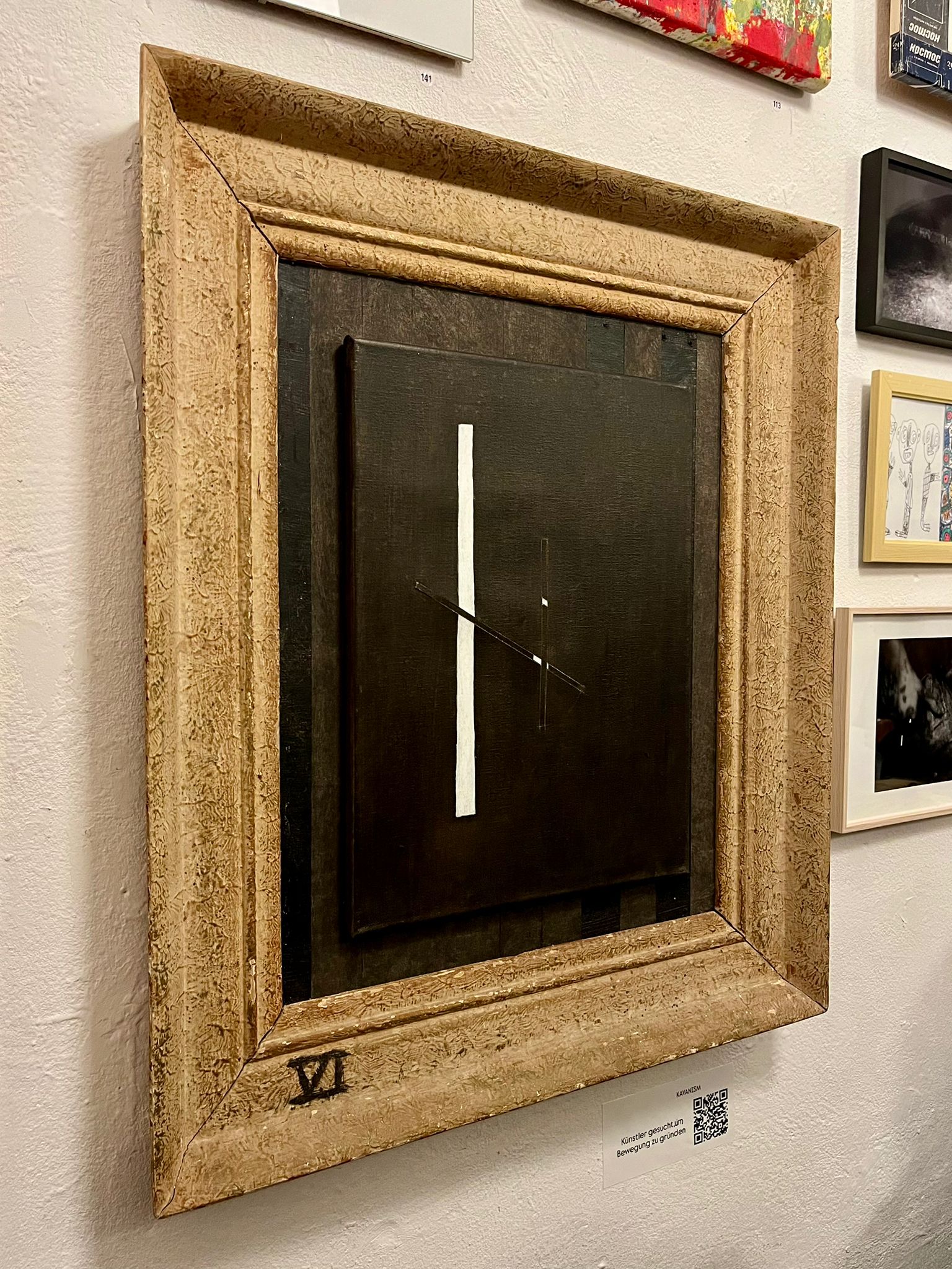 Group exhibition Berlin, Kapitel 69: “Wahrheit und Niederlage – die ewigen Laster des Lebens” at Monday Art Saloon presenting a commentary on a vandelized Touch" (Touch 3) and two chairs for a dialogue with the vandalism Black marker on canvas 120X120 Cm (2024)